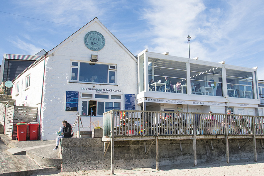Porthgwidden Beach Café is nestled beneath the steep grassy slopes of St Ives “Island”, right on the beach with unbeatable and uninterrupted views across St Ives Bay to Godrevy Lighthouse. The café is now open all year round.